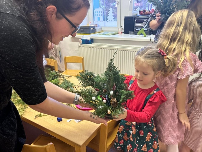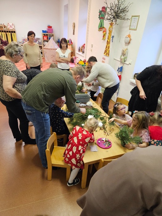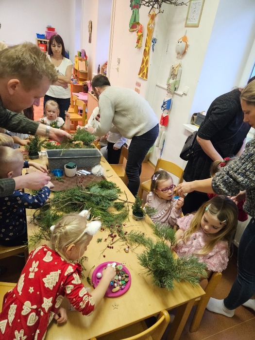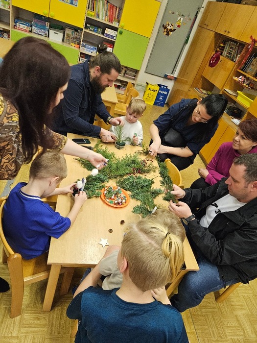 Po vystoupení čekala na všechny ještě příjemná kreativní část – výroba vánočního svícnu z přírodnin a připravených dekorací. Děti rodičům předvedly, jak si svícen představují, a společně tak vytvořili krásné sváteční dekorace, které si každý odnesl domů.