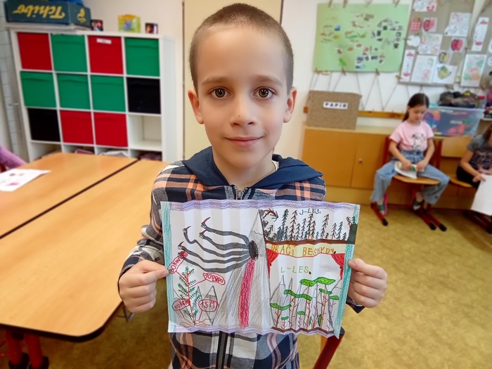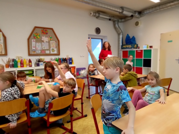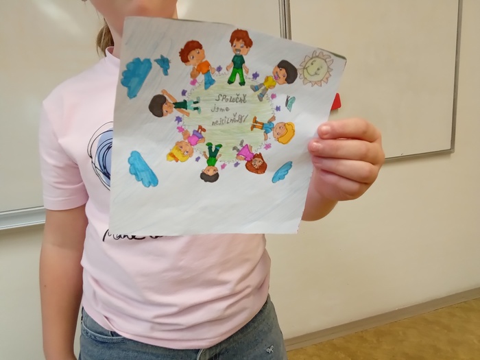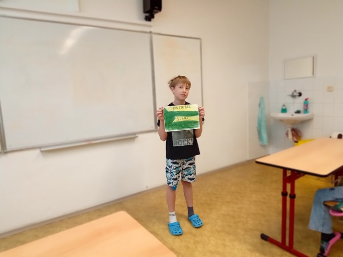 Děti ze školní družiny si vyzkoušely vystoupit před celou třídu a představit svůj obrázek. Namalovaly vlajku pro školní družinu, kde využily svou kreativitu. Vlajky se povedly. Všechny děti se zapojily s radostí a moc se jim to povedlo.