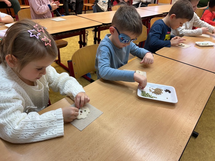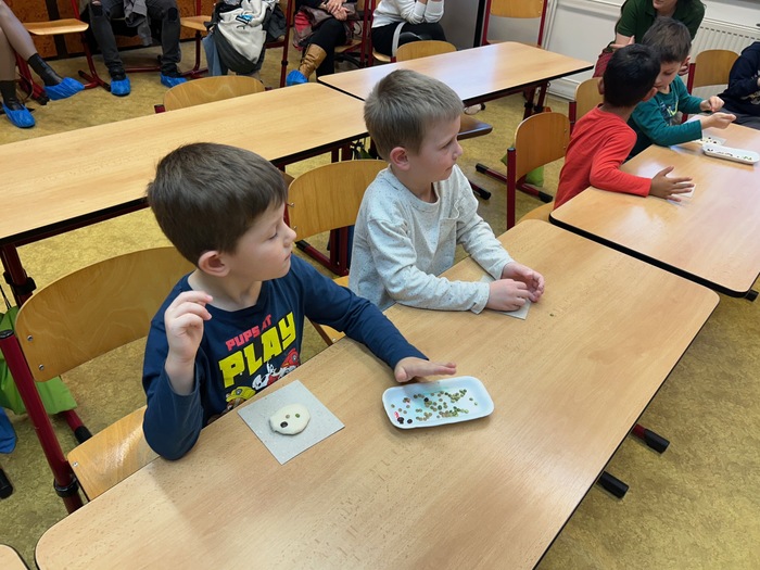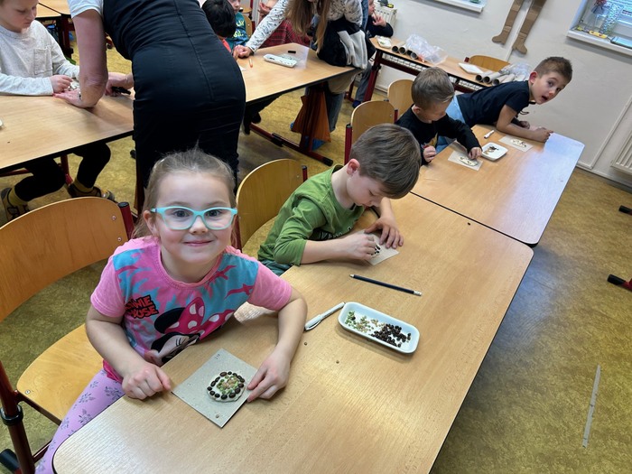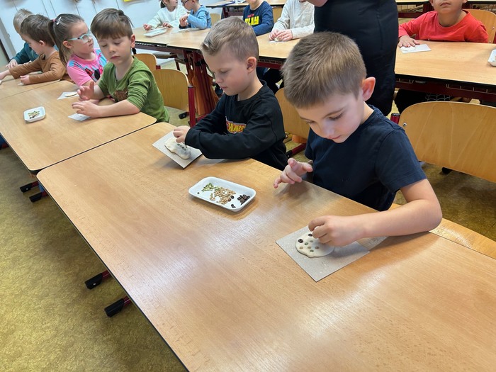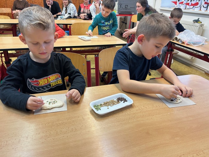 Součástí hodinového programu byla také „tvořivá dílna“. Malí cukráři z domácí modelíny zdobili na papírový „plech“ vlastní tvary lineckého cukroví. Tato činnost podporovala nejen jemnou motoriku, ale také kreativitu, fantazii a radost z hotového díla. Rodiče měli možnost sledovat, jak děti samostatně pracují, komunikují a zapojují se do skupinových aktivit – tedy dovednosti, které jsou pro vstup do školy zásadní.