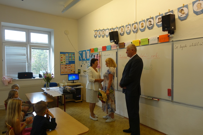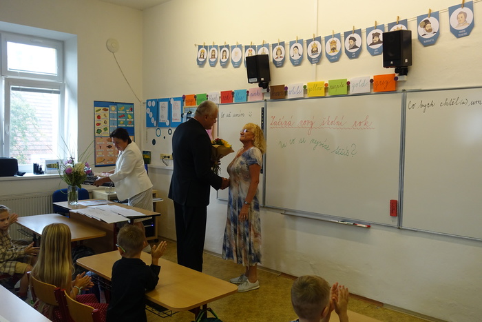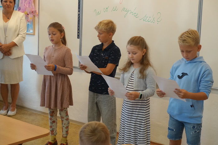 Za zvuku písně Zdeňka Svěráka a Jaroslava Uhlíře „Svět je malá škola“ vcházeli do třídy zástupci obce spolu s paní ředitelkou školy. Ta ve svém projevu přivítala přítomné žáky, rodiče i hosty. Její slova dokázala zmírnit napětí a rozzářit tváře nejen malých školáčků, ale i jejich rodičů. Poté promluvili zástupci obce. Popřáli prvňáčkům, aby se jim ve škole dařilo, učení přinášelo radost a nová přátelství. Program zpestřili žáci 4. ročníku krátkou uvítací básničkou z vlastní tvorby.